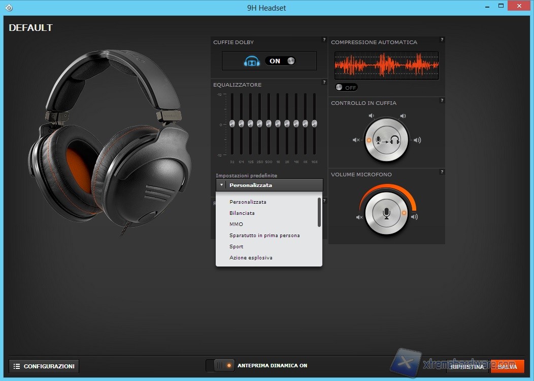 Ora, con un doppio click sulla Tab del prodotto accederemo al pannello di configurazione e potremo personalizzare o abilitare ogni voce relativa alle Steelseries 9H. In questo caso potremo abilitare, partendo dall’alto, il Dolby Logic IIx oppure attivare la compressione del suono. Non mancano i preset di base che spaziano da quello personalizzato, in cui potremo agire sull’equalizzatore e variare ogni frequenza, a quello film, musica, MMO, prima persona e così via. Non mancano le opzioni per regolare il volume del microfono sia in cuffia che quello diretto per la chat vocale. Per le 9H ci viene messo a disposizione anche l’opzione per abilitare o meno il controllo rumore sul microfono per ridurre al minimo i rumori di sottofondo che potrebbero dare fastidio all’interlocutore durante una chat vocale.