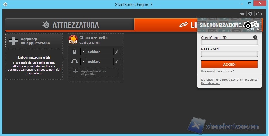 Sempre da questo schermata protremo ricercare aggiornamenti per il programma cliccando sulla prima icona in alto a destra; la seconda icona ci permetterà di impostare la lingua e scegliere se avviare o meno il programma con l’avvio del sistema operativo mentre l’ultima, ovvero lo Steelseries Cloud (ancora in fase beta), ci permetterà dopo aver creato un account di accedere ad un supporto diretto per i prodotti, personalizzare i profili caricati online delle proprie periferiche, avere la possibilità di essere seleszionato come Beta Tester per nuovi prodotti e molto altro. A lato della Tab Attrezzatura troviamo la Tab Libreria che ci permetterà di caricare un’applicazione ed i relativi profili precedentemente creati nella Tab relativa al prodotto come in questo caso le Steelseries 9H o il mouse Rival.