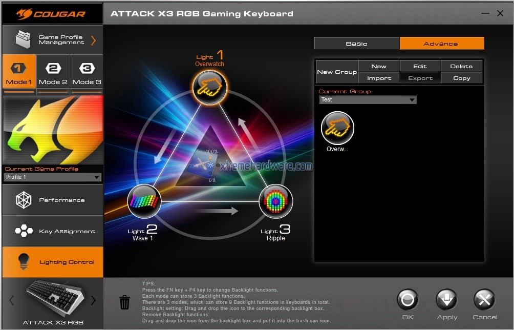 Inoltre come per le Macro se volessimo una personalizzazione ulteriore della tastiera con singola retroilluminazione del tasto dovremo passare al Menù laterale ‘’Advance’’, creare un gruppo/Profilo, e in questo modo accederemo al Menù avanzato della retroilluminazione.