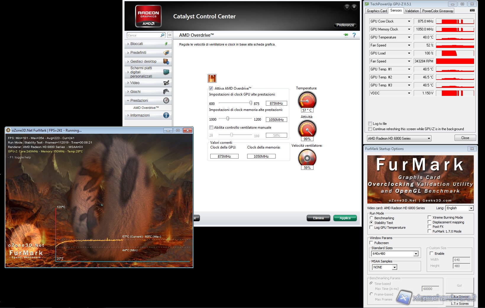 Passiamo adesso ad analizzare l'overclock di questa scheda video, ricordando che questa Gigabyte Radeon HD 6850 1GB parte già da frequenze leggermente maggiori rispetto da una versione standard. Infatti come abbiamo evidenziato abbiamo il core a 820 MHz contro 775 MHz della reference, mentre le memorie lavorano a 1050 (4200 effettivi) MHz contro i 4000 MHz del modello reference. Usando il Catalyst Control Center nella sottosezione Overdrive ci è stato possibile spingere a fine corsa le frequenze di questa Gigabyte rimanendo in perfetta stabilità. Il CCC ci permette infatti di impostare per il core un massimo di 875 MHz, mentre per le memorie il massimo impostabile è 1200 MHz. Ricordiamo inoltre che la scheda non supporta OC GURU, un tool sviluppato da Gigabyte che oltre a cambiare le frequenze può intervenire anche sui regolatori di tensione. In questo modello Overclock Edition, però non è supportato in quanto ha un regolatore di tensione per il core grafico NCP5395 IC, mentre di norma sui modelli reference viene montato il CHIL8214-03 IC. Inoltre segnaliamo ancora che le memorie sono Hynix H5GQ1H24AFR-T2C IC che possono lavorare a 1250 MHz (5 GHz effettivi). Alleghiamo le schermate effettuate con il CCC dei Catalyst 11.1 WHQL: