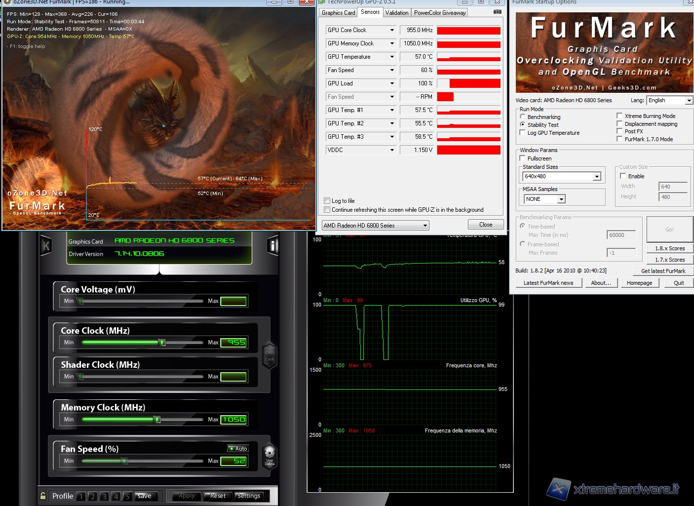 Non contenti dei risultati ottenuti tramite il CCC che come immaginavamo bloccava di fatto le potenzialità della scheda prodotta da Gigabyte, abbiamo pensato di usare un apposito tool normalmente usato per aumentare le frequenze di core e memorie. I risultati ottenuti sono davvero superlativi, abbiamo raggiunto una frequenza stabile per il core di ben 955 MHz. La scheda inoltre è riuscita a concludere benchmark a ben 975 MHz anche se ovviamente non in maniera stabile. Mentre le memorie le abbiamo settate tranquillamente a 1250 MHz come da specifica Hynix. Potete osservare questi risultati nelle immagini sottostanti (segnaliamo come gpu-z non rilevi correttamente il numero di rpm della ventola di raffreddamento):