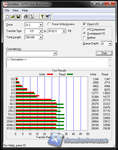 ATTO ci conferma i valori che abbiamo già ottenuto con HD Tune, abbiamo un media di circa 33 MB/s in lettura a partire da blocchi dati di 64 KB, mentre al di sotto di questo valore abbiamo transfer rate sempre più ridotti. In scrittura abbiamo una media di circa 28 MB/s costanti fin da blocchi da 64 KB a 8 MB.