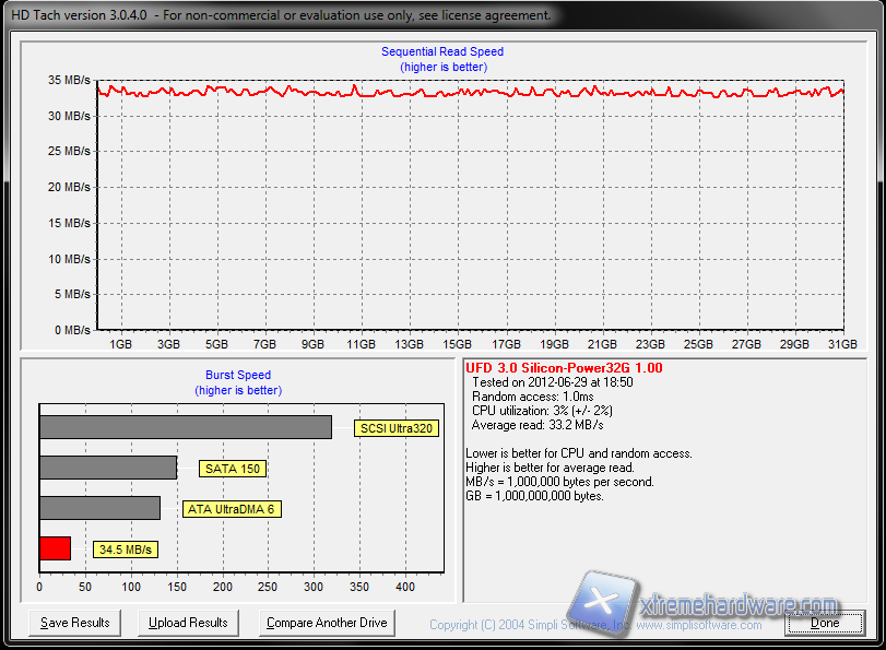 Anche i test eseguiti con questo benchmark confermano i valori precedentemente registrati dagli altri test. Abbiamo una media di lettura attorno ai 33 MB/s con un access time di circa 1 ms.
