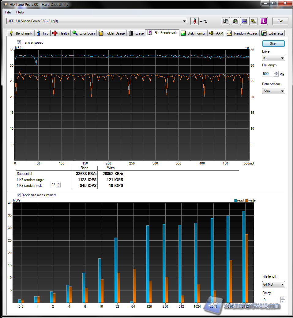 Come si può vedere dai grafici generati dal programma HD Tune, abbiamo una situazione molto limitativa causata dalla limitatezza della banda passante della connessione USB 2.0. Infatti in modalità sequenziale abbiamo una media di circa 33 MB/s in lettura e di circa 26 MB/s in scrittura; 1128 IOPS con dati da 4KB singoli in lettura e 121 IOPS in scrittura; 845 IOPS utilizzando dati 4KB multi e 10 in scrittura IOPS. In modalità sequenziale abbiamo inoltre un access time di 0.991 ms in lettura.